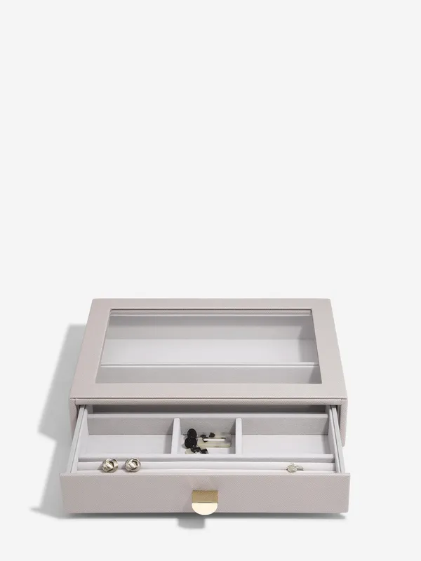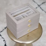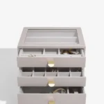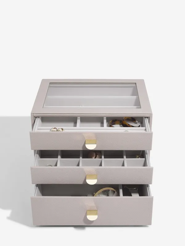 Elegant 3-piece jewellery drawer set with a clear glass lid, designed to keep your collection organized and expandable as it grows.