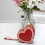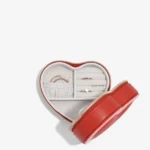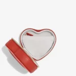 Heart-shaped travel jewellery box with ring roll, chain loops, and a zipped pouch — ideal for home or travel. Finished in faux leather with velvet lining.