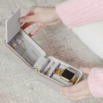 Compact travel jewellery box with soft velvet lining, dedicated watch pad, and internal dividers — perfect for trips or bedside storage.